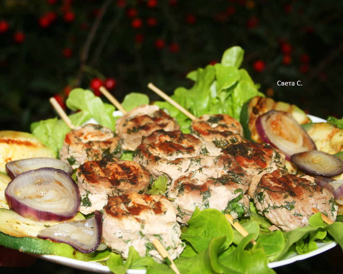 Шаг 5: Готовые шашлыки и овощи подают на листьях салата. Это сочетание не только радует глаз, но и удивляет вкусом. И, как показывают отзывы, ваше блюдо непременно станет хитом на столе!