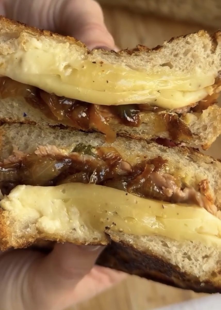 Этот сэндвич — это гармония сладкого карамелизированного лука, пикантного сыра и нежной ветчины, что делает его идеальным выбором для завтрака, обеда или перекуса. Простой в приготовлении и невероятно вкусный — он точно не оставит равнодушным!