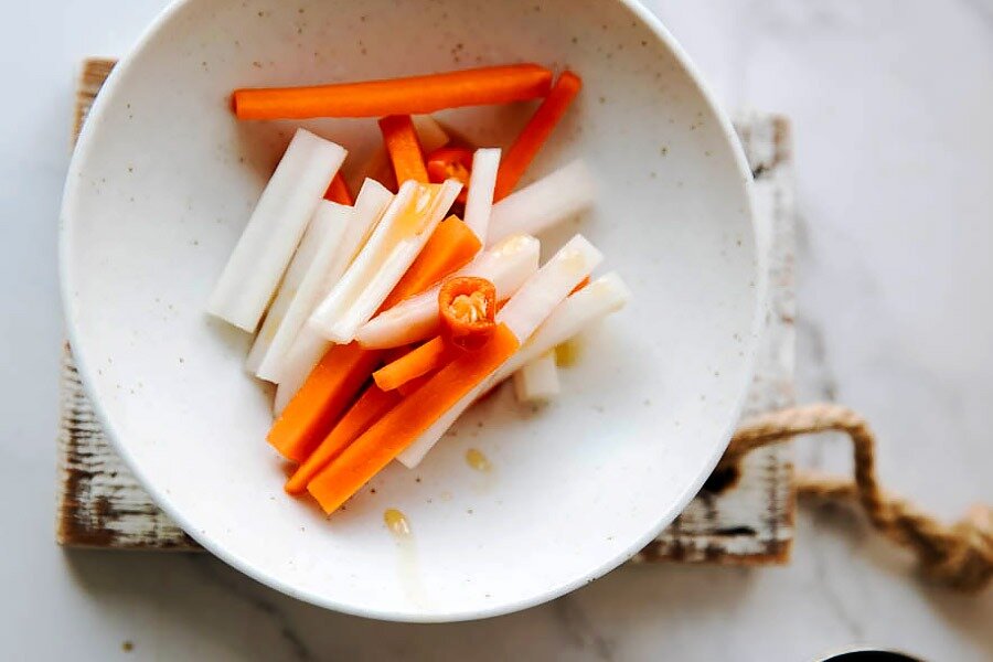 - В глубокой миске перемешать морковь и дайкон с половиной столовой ложки соли и оставить на 20 минут, чтобы появился сок. После этого тщательно промыть.