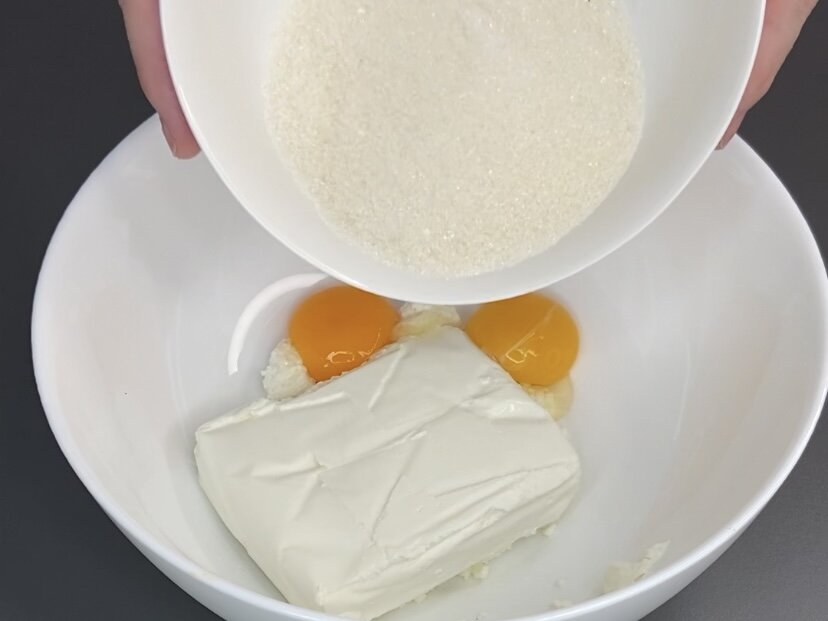 1. В глубокой миске поместите творог с жирностью 5% или 9%. Если он крупнозернистый, предварительно перемешайте его с помощью блендера до однородного состояния.