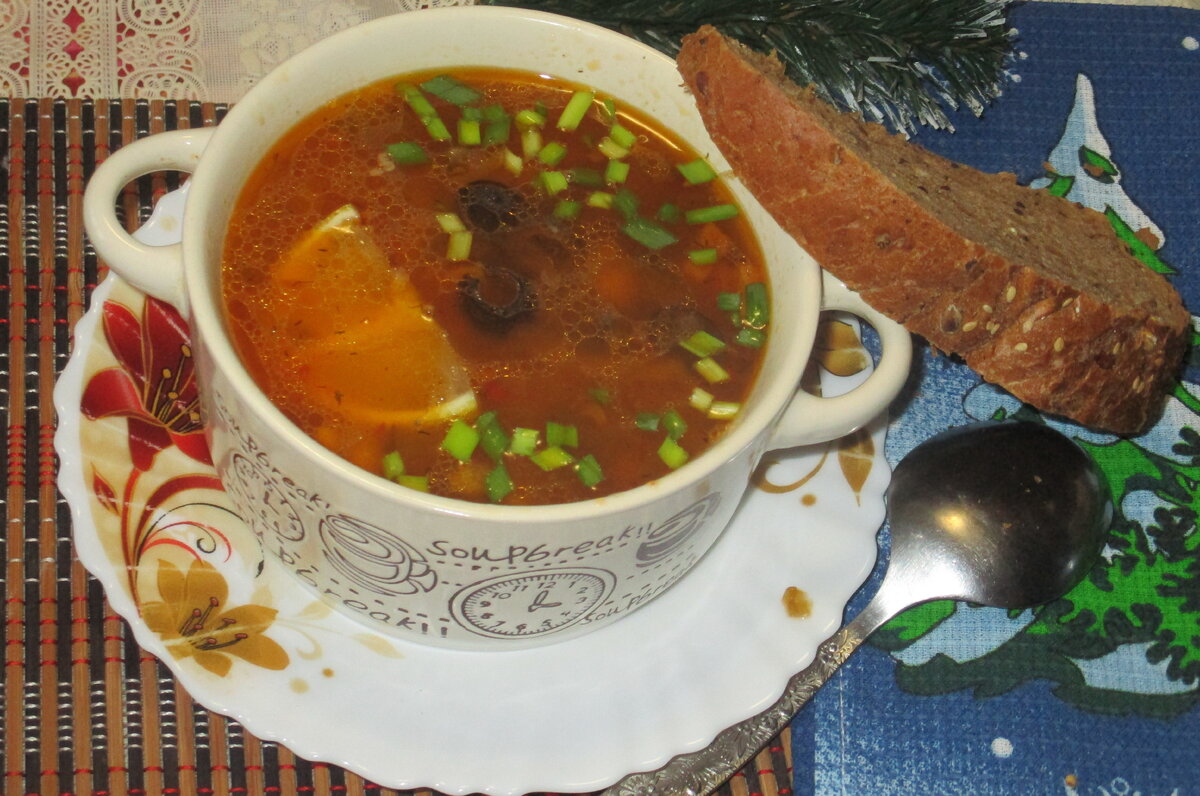 При подаче солянку украсить зеленым луком и добавить кусочек лимона с параллельной ложкой сметаны для особого вкуса. Наслаждайтесь насыщенным и ароматным блюдом!