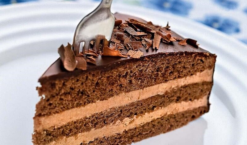 Вынув бисквит из духовки, оставить его остывать. Затем разрезать на три коржа, пропитать их водкой или сахарным сиропом, если торт готовится для детей. Уложить коржи слоями, промазывая между ними кремом, и сверху полить растопленным шоколадом. Оставить торт в холодильнике на 3 часа, а затем украсить шоколадной стружкой.