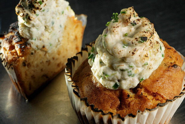 Сначала следует подготовить тесто. Необходимо объединить яйца и 180 граммов сахара, взбивая массу до образования пены. Затем добавить сыр Филадельфия, сливочное масло, муку, соду с лимонным соком и разрыхлитель. Все тщательно перемешать на маленькой скорости блендера до получения однородной консистенции.Для приготовления крема смешивают 150 граммов сыра Филадельфия с мелко нарезанным крабовым мясом, измельченным шнитт-луком, растительными сливками и тертым имбирем. Приправить свежемолотым черным перцем, перемешать и оставить в холодильнике на полчаса.В основное тесто добавить цветки тимьяна и орегано. Распределить смесь по формам для кексов и выпекать при температуре 180 градусов в течение 15-18 минут.По окончании готовности кексов выложить на них крабовый крем при помощи кулинарного мешка и, при желании, слегка обжарить их газовой горелкой. Капкейки подаются теплыми, что позволяет максимально раскрыть их вкус.