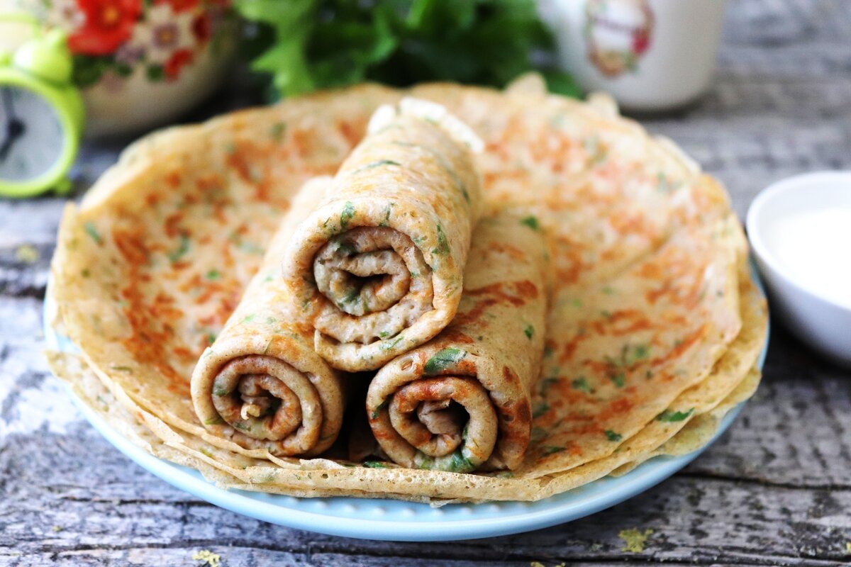 Мягкие и румяные блинчики, наполненные сыром и душистыми травами, прекрасно подходят для любого приема пищи. Их изумительный вкус в сочетании со сметанно-чесночным соусом создаст незабываемое гастрономическое ощущение. В этом рецепте используются как пшеничная, так и ржаная мука, но можно ограничиться только пшеничной, если так удобнее.