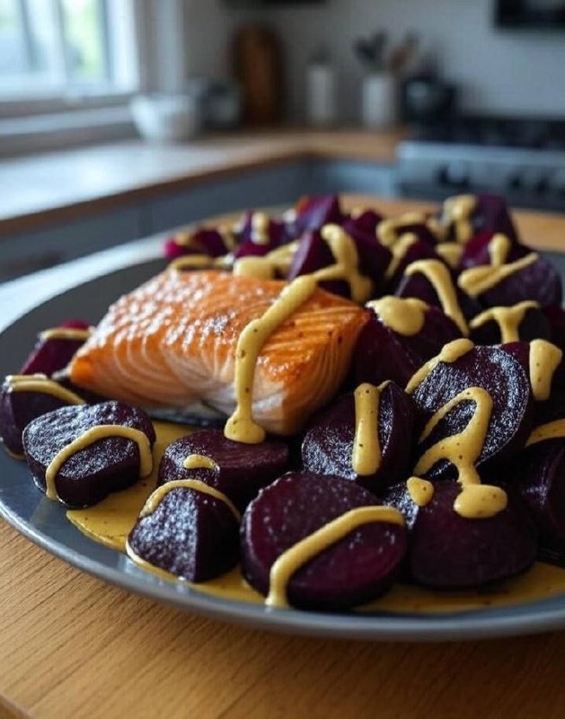 Приготовьте незабываемое блюдо из свежего лосося с запеченной свеклой и пикантной горчичной заправкой. Это не только вкусно, но и полезно!