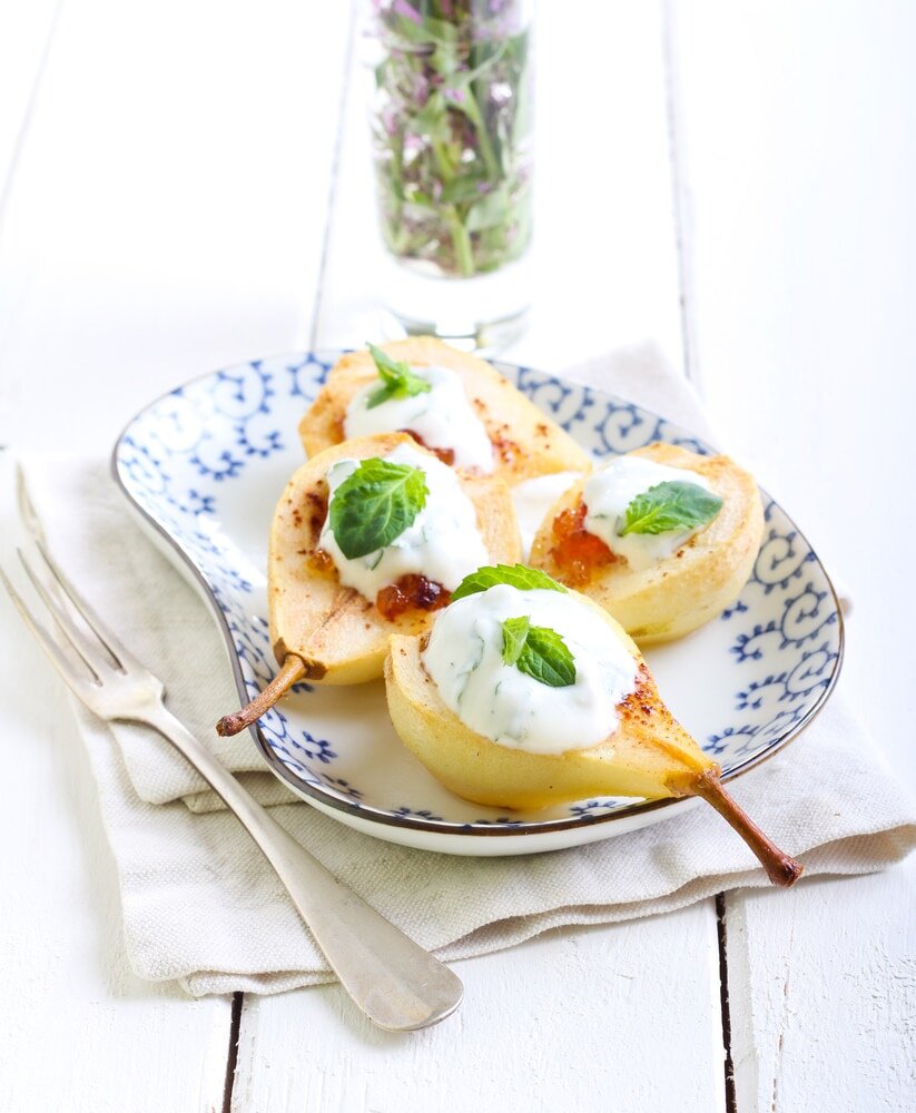 После запекания дайте грушам немного остыть и переложите их на порционные тарелочки. Сверху полейте мягким фруктовым йогуртом и добавьте по листочку свежей мяты для аромата.