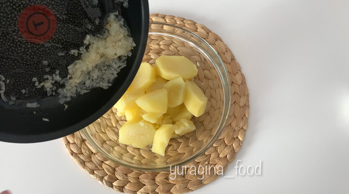 Чтобы начать, картофель необходимо отварить до готовности, затем лук обжарить на небольшом количестве растительного масла до золотистого цвета. Готовый картофель нужно тщательно растолочь, добавив обжаренный лук.