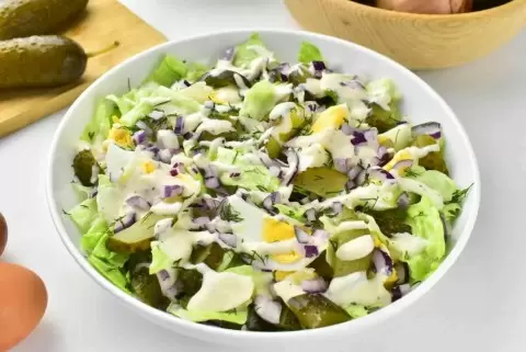 Этот салат стал настоящей находкой для любителей быстрых и изысканных блюд. В нем собраны все элементы, которые обеспечивают идеальный баланс: хрустящие огурцы, насыщенный вкус яиц, нежный лук и потрясающая кремовая заправка из майонеза с горчицей. Это отличный выбор для того, чтобы разнообразить повседневный ужин или подать в качестве гарнира к вашим любимым блюдам, будь то гуляш, запеченный картофель или жареная рыба.