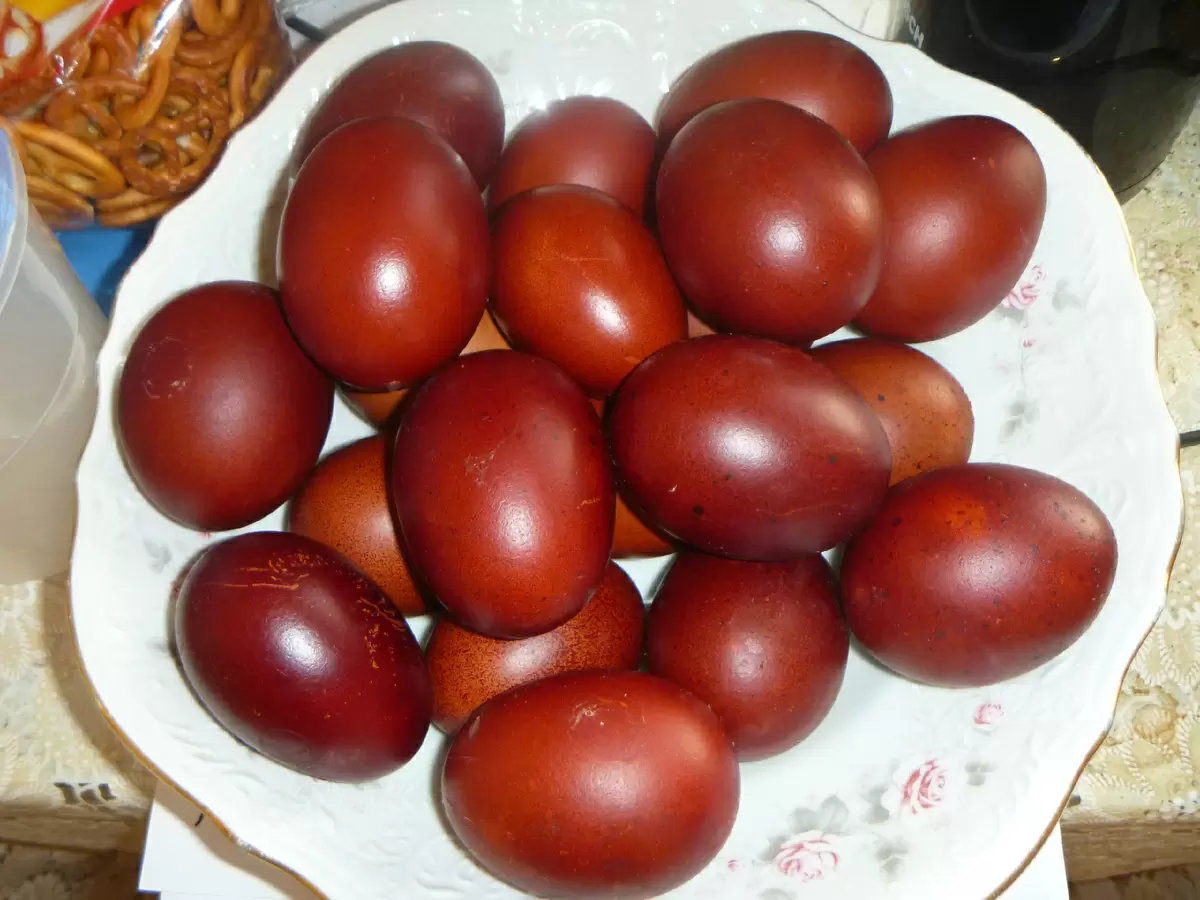 - Луковая шелуха: Для создания богатого коричневого цвета достаточно варить шелуху в воде с уксусом, а затем погрузить яйца в полученный настой.