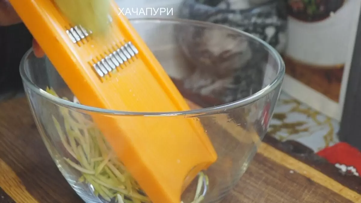 Первым шагом является натирание кабачков на крупной терке, предназначенной для корейской моркови. Точно так же поступают и с огурцом и морковью. Если такой терки нет, можно нарезать овощи соломкой — они все равно получатся вкусными.