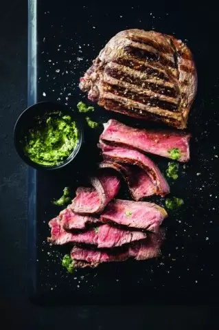 10. При подаче нарезать мясо на тонкие ломтики и дополнить соусом чимичурри.