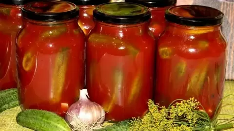 Маринованные огурцы и помидоры в томатном соусе — это не просто закуска, а настоящий кулинарный шедевр. Такое сочетание свежести овощей и насыщенного томатного вкуса с легкой сладостью и пряностями делает заготовку универсальной. Упакованные в банки, они отлично сочетаются с мясными блюдами, гарнирами или просто как самостоятельная закуска. Особенное очарование этой закуски в том, что ее вкус и аромат сохраняются даже после долгого хранения.
