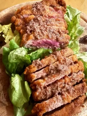 - Приготовление: подготовьте стейк, обваляйте его в панировке и обжарьте до золотистой корочки. Приготовьте соус, смешав анчоусы с другими ингредиентами, пока он не станет однородным.