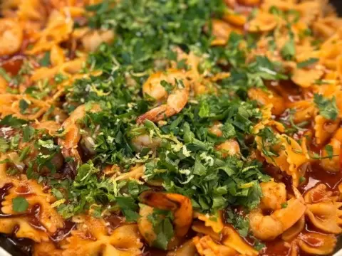Тщательно разморозить креветки, очистить их, удалить хвостовые жилки и обсушить.На плите закипятить воду для пасты и разогреть сковороду для приготовления креветок.В сковороду добавить растительное масло и паприку, готовить около 30 секунд на среднем огне. Затем выложить креветки в один слой.Когда креветки начнут розоветь, перевернуть их, добавить коньяк и дать ему испариться.Пока готовятся креветки, следует бросить пасту в кипящую воду и сварить её на одну минуту меньше, чем указано на упаковке.Добавить к креветкам нарезанные помидоры, орегано, тимьян и сахар. При желании, можно добавить немного соли.Как только томаты закипят, перенести готовую пасту в сковороду с креветками, стараясь оставить часть воды из кастрюли.Посыпать все мелко нарезанным чесноком и тщательно перемешать, чтобы паста пропиталась соусом.Завершить блюдо рубленой петрушкой и, если есть желание, сбрызнуть соком лимона и посыпать цедрой.Такое восхитительное угощение точно украсит любой обед или ужин. За столом — настоящий ангел!