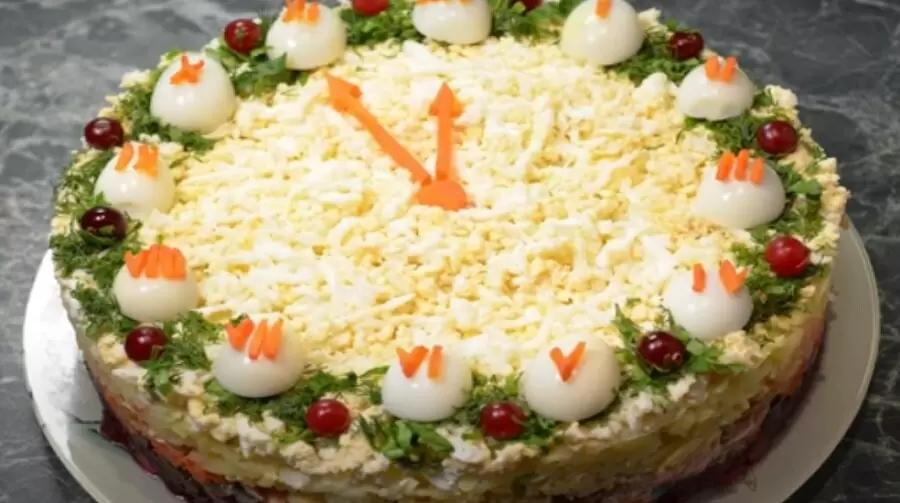 Для оформления потребуются вареные перепелиные яйца, свежая зелень, нарезанные фигурки из моркови и ягоды клюквы. Перед подачей размельчается зелень, а яйца разрезаются пополам. Край салата обсыпается зеленью, а половинки яиц располагаются, формируя циферблат. Для обозначения часов используются вырезки из моркови, а ягоды клюквы можно заменить мелкими помидорами черри или оливками.