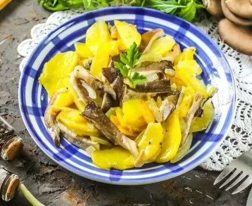 Если картофель немного подрумянится, добавьте нарезанные вешенки.