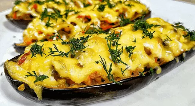 Лодочки из баклажанов заполняются фаршем, сверху можно украсить зеленью и смазать сметаной или майонезом. Завершающий штрих - посыпка тертым сыром. Разогрев духовку до 180-200 градусов, отправить запекать на 30-40 минут до появления аппетитной золотистой корочки.