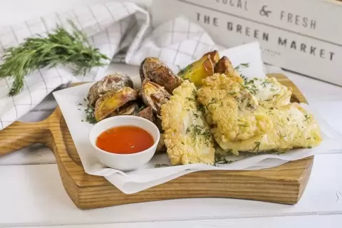 Шаг 1: Разогрейте духовку до 220°C. Потратьте немного времени на подготовку картофеля: нарежьте его дольками, посолите и поперчите по вкусу, добавив прованские травы. Выложите картофель на противень и полейте небольшим количеством растительного масла. Запекайте на протяжении 20-25 минут. За это время мелко нарежьте чеснок. В миске взбейте яйца с добавлением соли, перца и кориандра, затем постепенно внедрите муку. Должна получиться однородная масса. Проверьте филе трески на наличие костей, удалите их по необходимости, и нарежьте порционно.