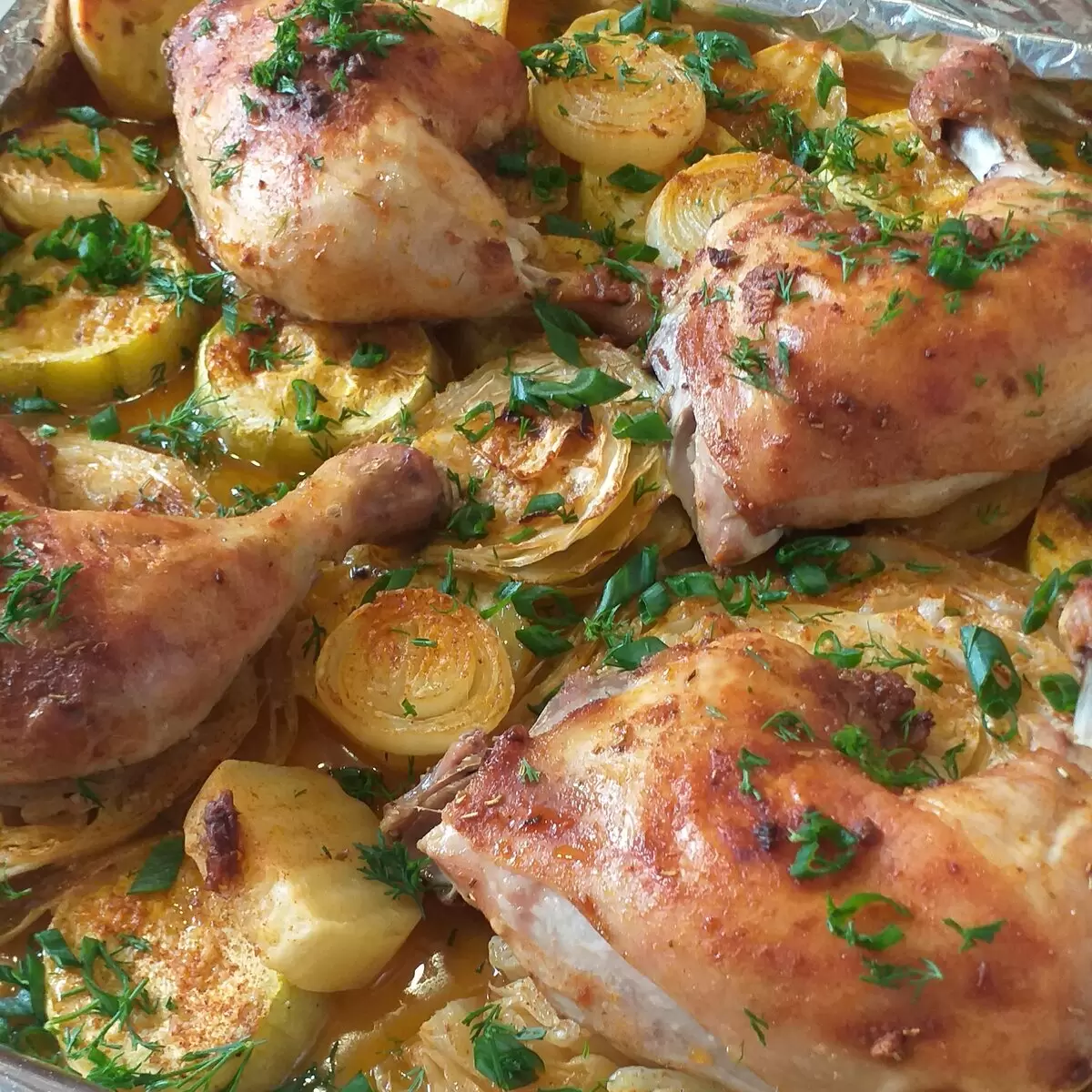 Блюдо получается не только вкусным, но и сочным. Все, что нужно сделать, это тщательно обмазать куриные окорочка любимыми специями, дать им немного отдохнуть, нарезать овощи и уложить всё на противень. После этого духовка сделает за вас всю работу!