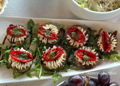 После обжарки баклажаны выкладываются на бумажное полотенце, чтобы избавиться от избытка масла. Для начинки 200 граммов творожного сыра смешивают с мельчеными грецкими орехами и кинзой, при желании добавляя чеснок. Взбивается до однородной консистенции и помещается в кондитерский мешок. Начинка аккуратно отсаживается на каждый баклажан, сверху располагаются вяленые томаты, а затем закуска поливается соусами — песто и бальзамическим. На завершение блюдо украшается рукколой.