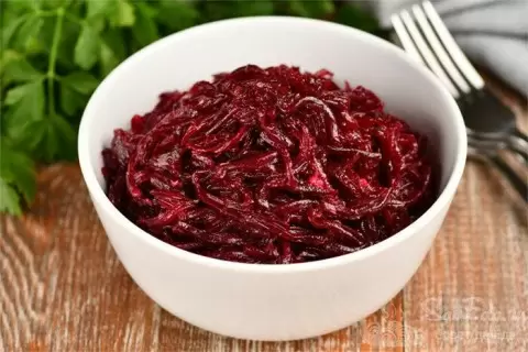 Для этого варианта потребуется две средние свеклы, которые можно запечь или отварить, а затем нарезать соломкой. Заварив свеклу, приготовьте заправку: в миске смешайте один зубчик чеснока, 1 ч. л. острой горчицы, 1 ч. л. сахара, 3 ст. л. растительного масла и 1,5 ст. л. лимонного сока. Добавьте щепотку сушеных трав.
