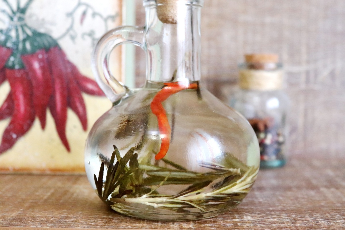 Первым делом нужно взять небольшой кувшин или баночку. В неё следует налить уксус и добавить веточки розмарина, а также нарезанный перец чили. После этого важно плотно закрыть ёмкость пробкой, чтобы сохранить все ароматы внутри.