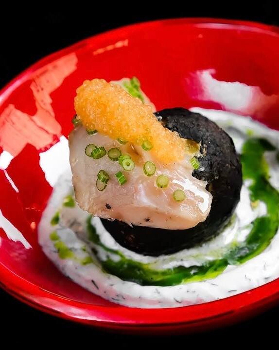 - десерт из орехов и брусники с копчёным мороженым и икрой.