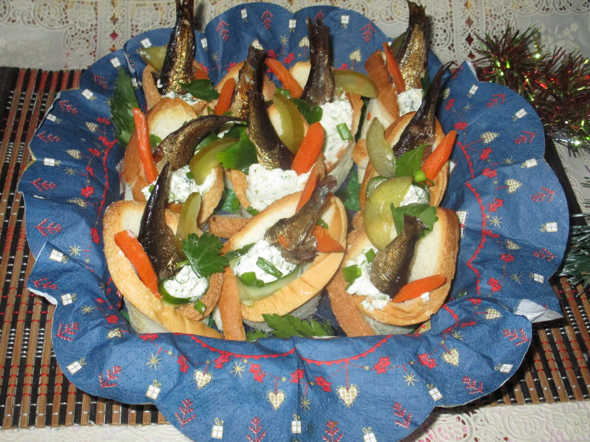 Для классической версии бутербродов, хлеб нарезается пополам, покрывается сливочным сыром, добавляются шпроты и овощи, а сверху украсить можно нарезкой моркови и зеленым луком.