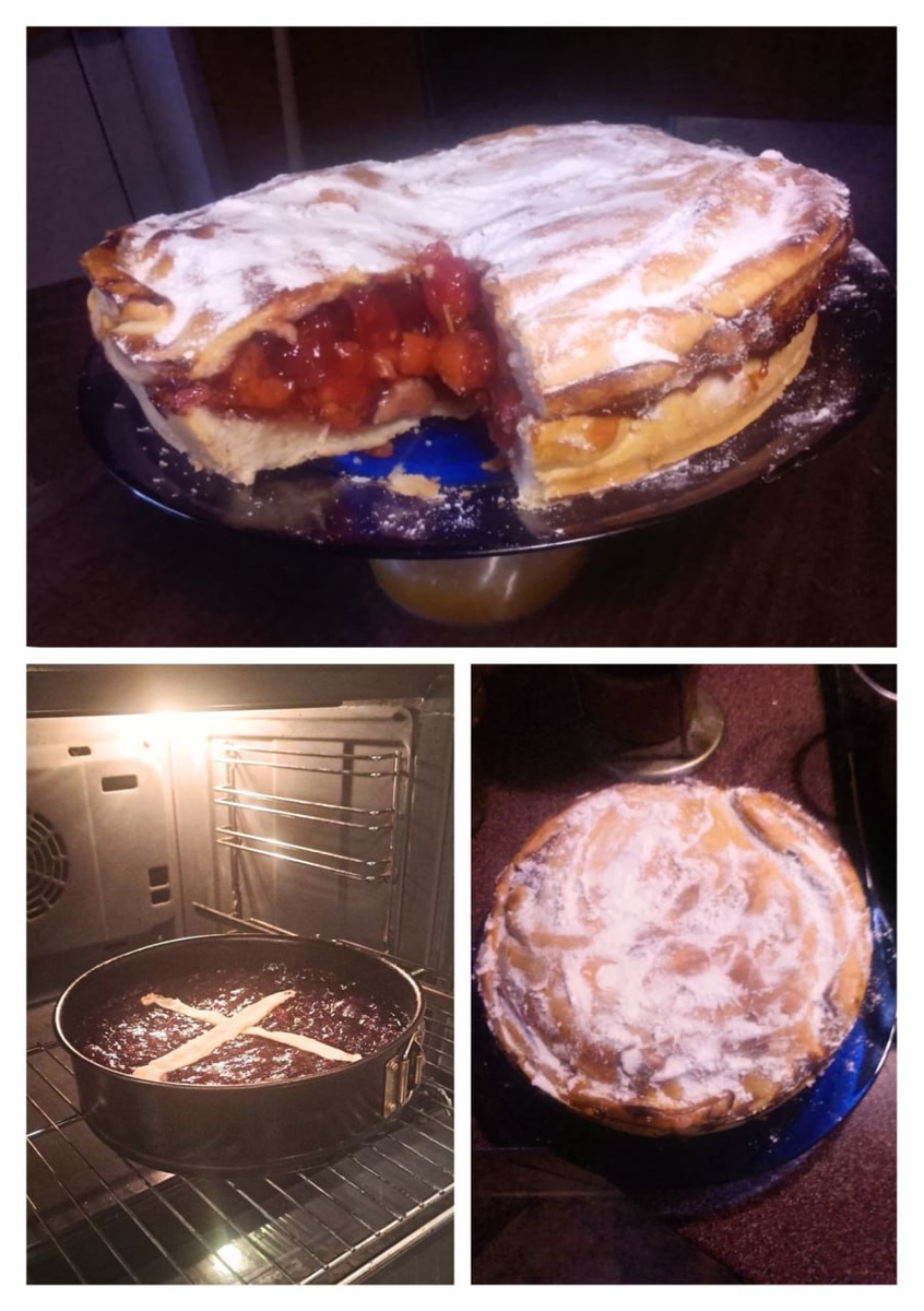 Разогрейте духовку до 220 °C. Раскатайте тесто и выложите в формочку с высокими краями. Выложите охлаждённую начинку до краёв, сверху оформите сеткой из теста. Выпекайте в течение 30–35 минут, лучше подложить на дно духовки бумагу для выпечки или пустую форму, чтобы избежать вытекания начинки.