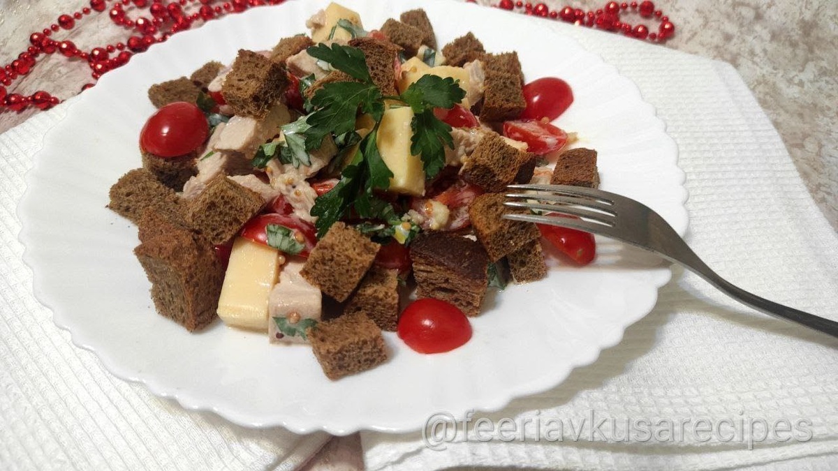 Для начала стоит заняться черным бородинским хлебом — его нарезают на небольшие кусочки и подсушивают в духовке на протяжении 10 минут при температуре 180 градусов, не забывая периодически помешивать. Ингредиенты должны быть свежими: сыр нарезается кубиками (рекомендуется голландский или российский), помидоры черри разрезаются пополам, их потребуется совсем немного, что не ударит по вашему бюджету.