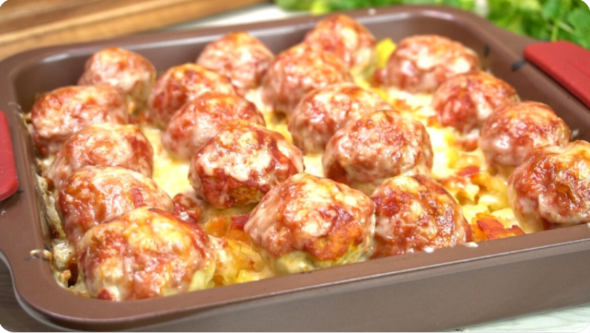 Когда картофель готов, слейте воду и поместите его в смазанную маслом форму. Осторожно разомните его вилкой, избегая превращения в пюре, чтобы сохранить текстуру. Выложите сверху мясные шарики.
