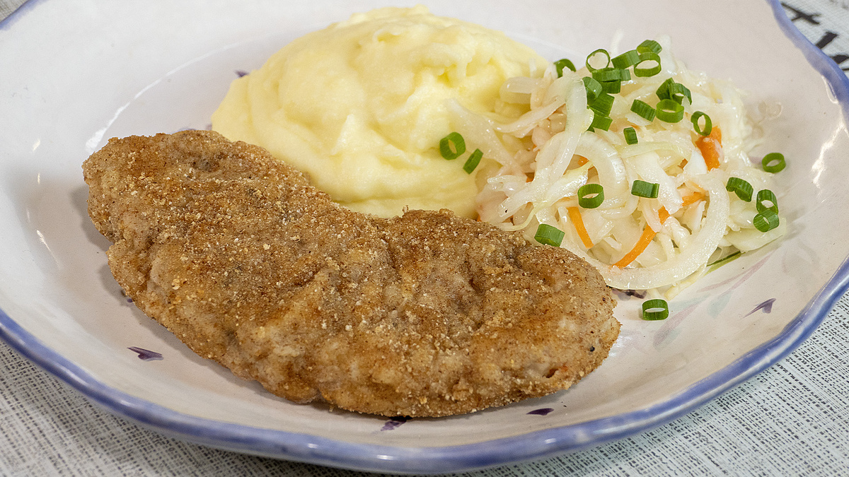Готовый шницель подавайте с квашеной капустой и картофельным пюре, щедро украсив зеленью. Это идеальное угощение для любителей простоты и уюта в блюдах. Наслаждайтесь и приятного аппетита!