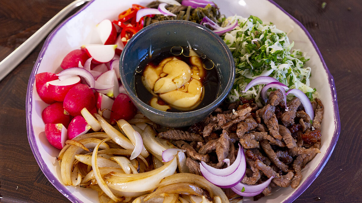 На широкую тарелку выкладываются все ингредиенты: папоротник, капуста, редис, обжаренный лук и говядина. Все это посыпайте кедровыми орехами, нарезанным красным луком и свежим чили.