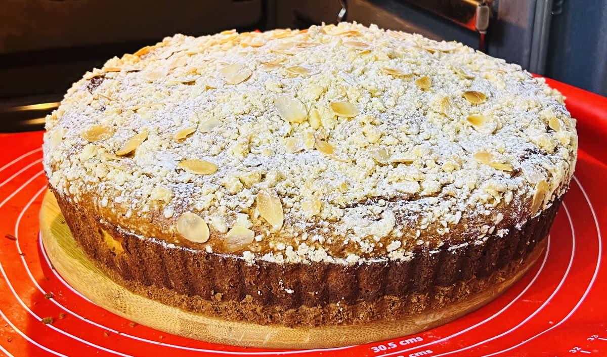 Когда тесто замешано, его нужно равномерно распределить по кондитерской форме, а затем аккуратно выложить начинку. Для эстетики можно украсить пирог сладкой масляной крошкой и миндальными лепестками. Поместите в разогретую до 175 градусов духовку на 45-50 минут, и наслаждайтесь ароматом, заполняющим ваш дом.