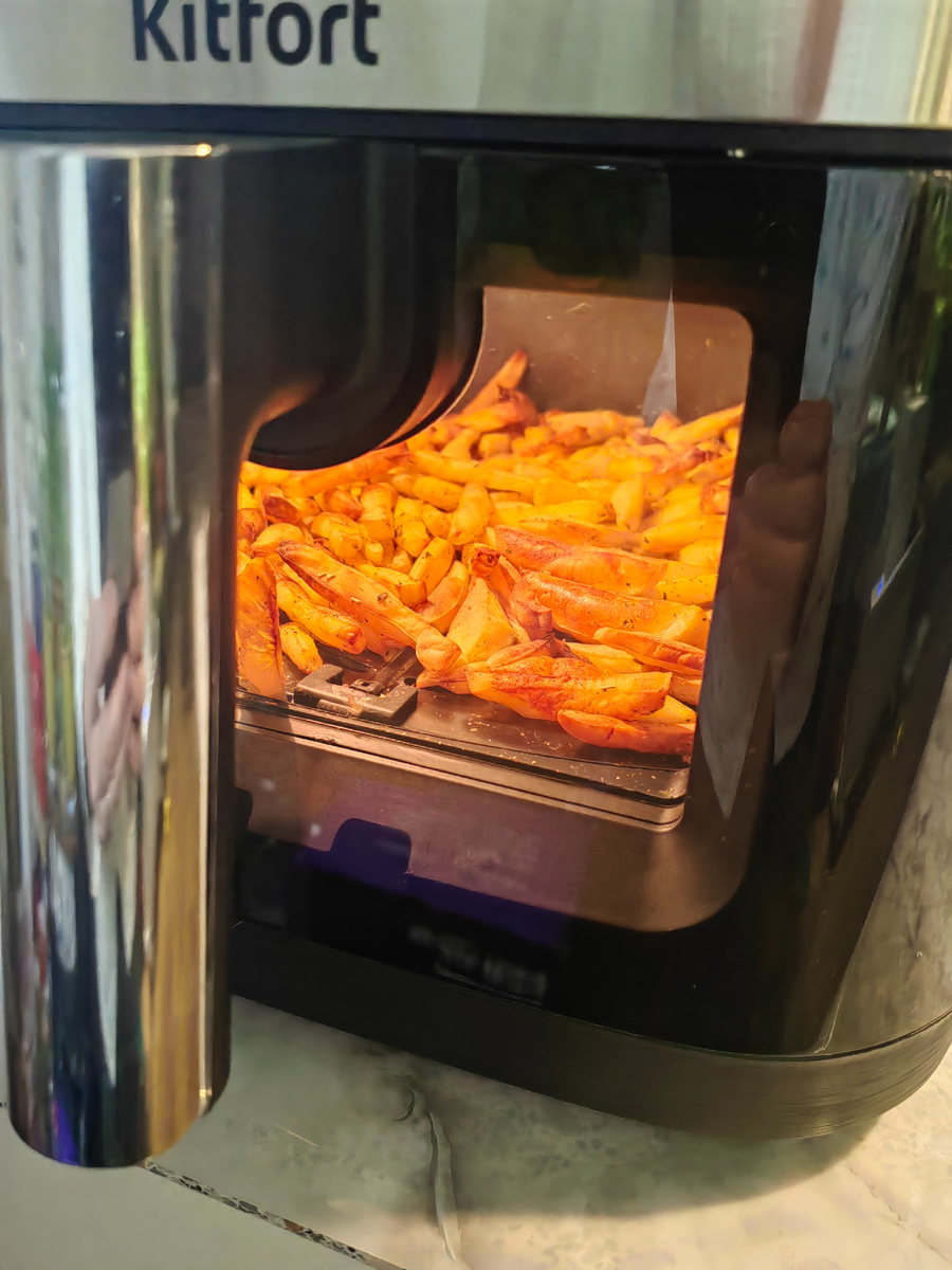 С решительностью и небольшим волнением нового повара, начинающего освоение аэрогриля, была поставлена задача — сделать румяную картошку. Благодаря окошку можно наблюдать за процессом готовки. Однако, как это часто бывает с первыми экспериментами, картошка слегка «пересидела» и была чуть чересчур зажаренной. Несмотря на это, результат оказался весьма удовлетворительным. И даже домашний кетчуп, который долго ждал своего часа в холодильнике, идеально подошел.