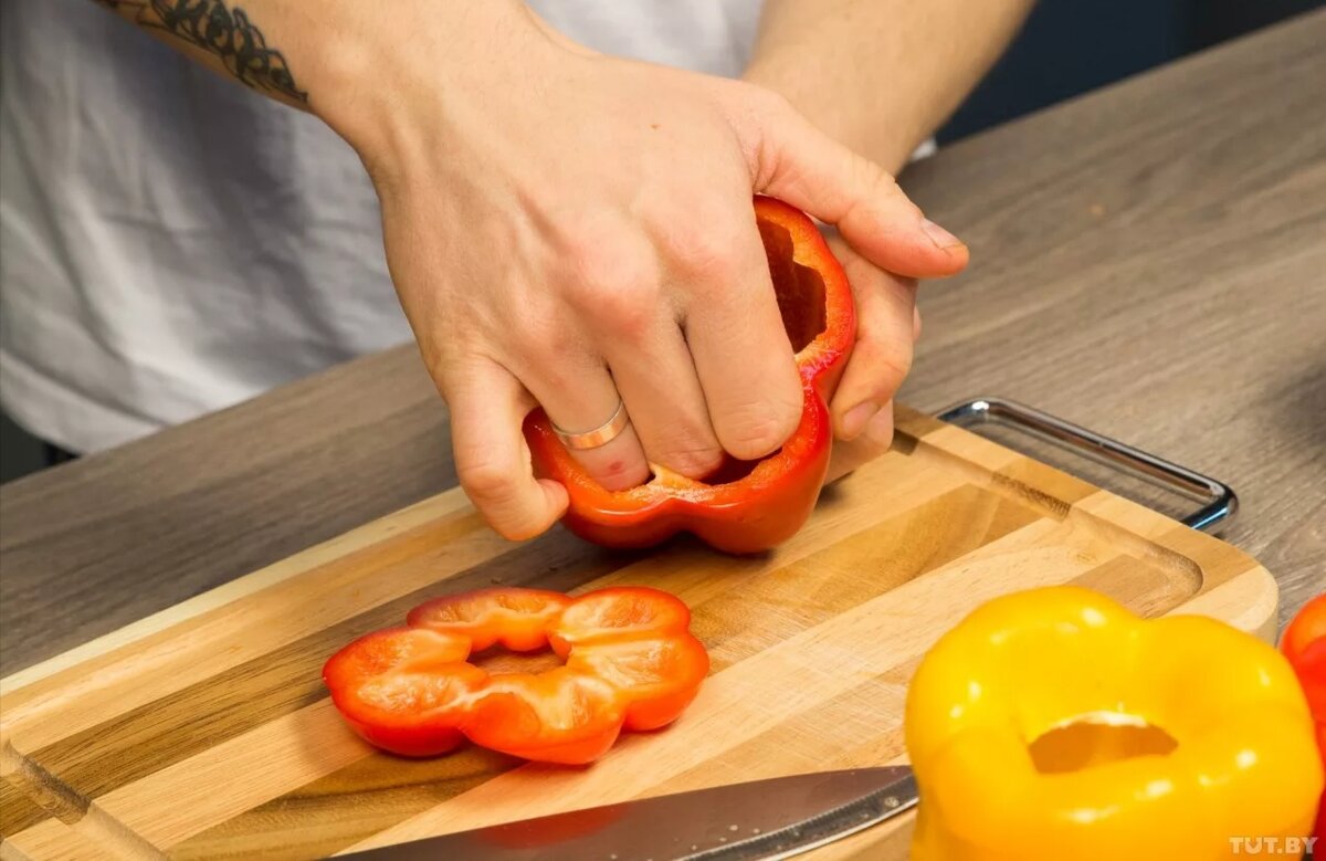 Рекомендуется нарезать перец на кусочки, что значительно облегчит процесс приготовления. Чеснок можно нарезать средними ломтиками.