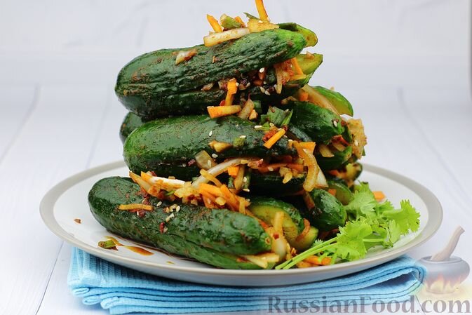 Есть ли у вас уже рецепты малосольных огурцов? Мы предлагаем сделать это блюдо с изюминкой. Отварите огурцы, затем заполните их смесью из натертой моркови, репчатого лука и чеснока. Добавьте немного соевого соуса, кунжута и специи. Оставьте на полчаса, и получите закуску, которая украсит любой стол.