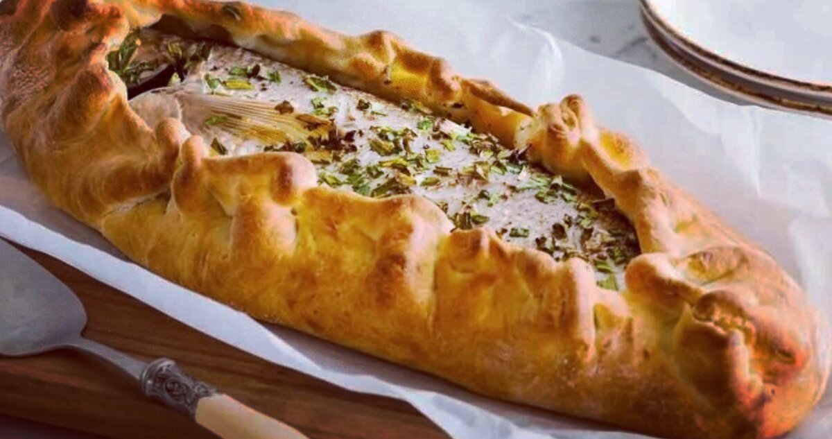 Раскатайте тесто в прямоугольный пласт толщиной 0,5-0,7 см. На него выложите оставшийся зелёный лук, а затем разместите подготовленную рыбу. Аккуратно закройте судака тестом, защипните края и сделайте несколько проколов вилкой сверху. Выпекайте рыбник в разогретой до 180°C духовке приблизительно 40 минут.