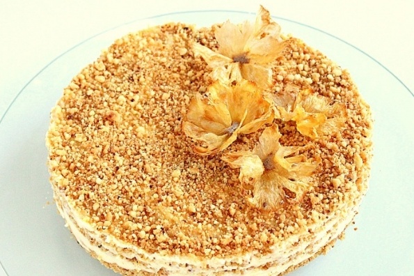 3. Сборка торта: В кулинарное кольцо, установленное на блюде, выложите слой крошки, затем равномерно распределите крем. Повторяйте слои до тех пор, пока все ингредиенты не закончатся. Затем поставьте торт застывать в холодильник. Через 3 часа можно дегустировать фирменный десерт, а для украшения подойдут любые лакомства, например, сушеные фрукты.