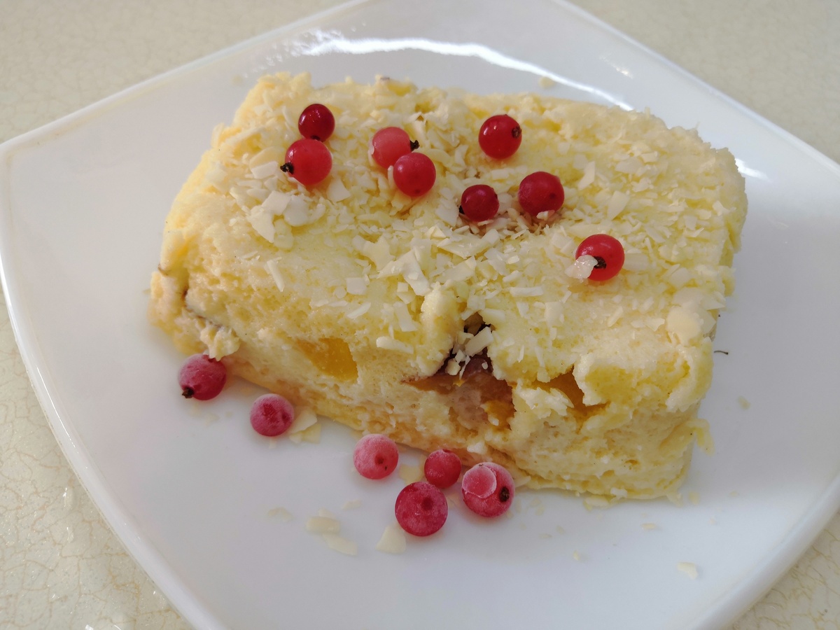 2. После этого добавьте к тесту нарезанный персик и тщательно перемешайте. Вылейте массу в подходящую для микроволновки форму. Включите микроволновку на 5 минут при мощности 700 Вт, но проверяйте по своей модели, чтобы избежать перепекания. Кекс будет влажным и ароматным, что неизменно порадует вас!