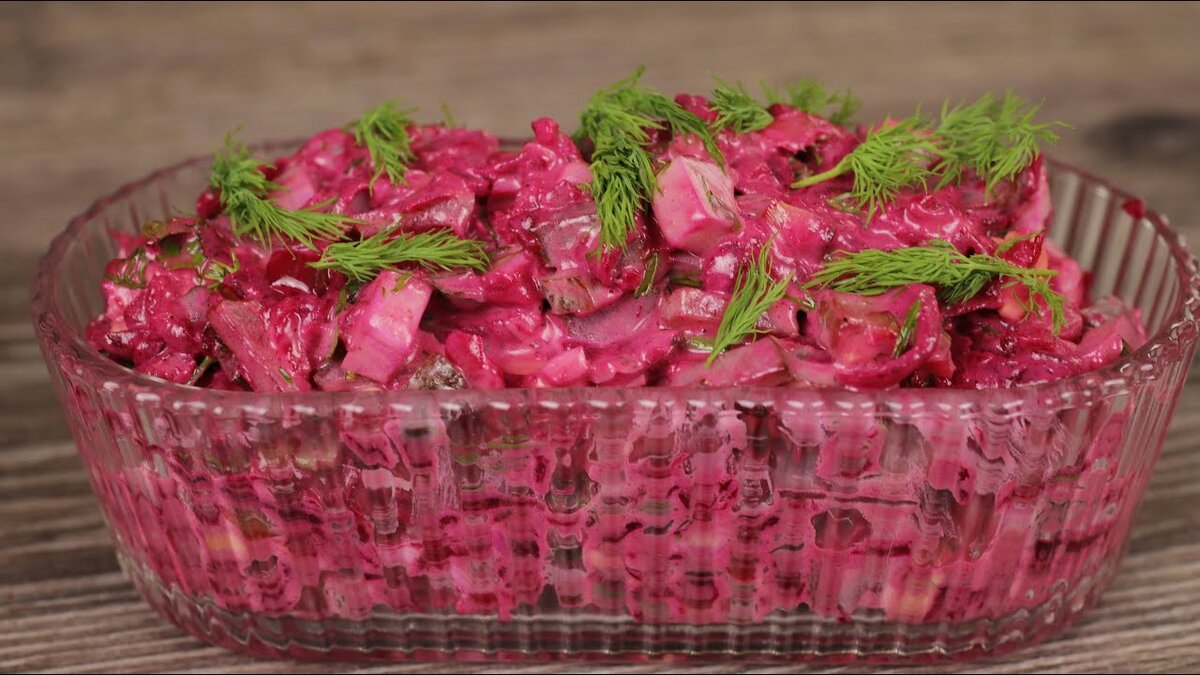 Нарезать лук на мелкие кусочки и обжарить на сковороде с растительным маслом до мягкости и золотистого цвета.Очистить вареную или запеченную свёклу и натереть на крупной терке, поместив её в большую миску.Добавить обжаренный лук к свёкле.Скористайтесь корнишонами, нарезав их на маленькие кубики, и положите их в ту же миску.Осторожно очистите яйца и нарежьте их не крупнее, чем огурцы, затем добавьте в салат.К зелени добавить мелко нарезанную петрушку и укроп, а при желании — выдавленный чеснок.Заправьте получившуюся массу солью, перцем и майонезом, тщательно перемешав все ингредиенты.Подготовленный салат положите в небольшой глубокий салатник и украсьте свежими веточками укропа.Салат готов к подаче! Уверены, он станет настоящим хитом на вашем столе.