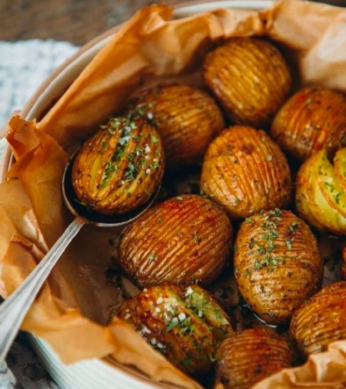 Картофель выкладывают на противень, выстеленный пергаментом, и обмазывают ароматным маслом, особенно в надрезах.