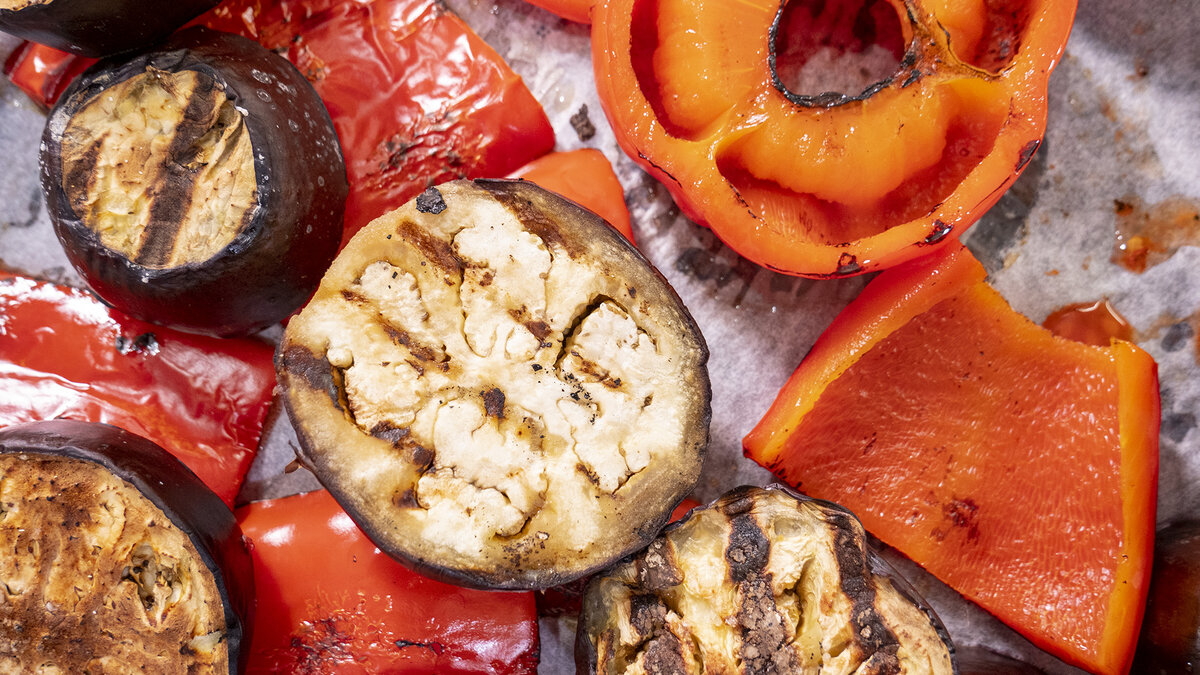 Первым делом необходимо разогреть чугунную сковороду-гриль. В то время как сковорода нагревается, крупно нарезаются баклажаны и болгарский перец, после чего овощи помещаются в миску с щепоткой соли. Один крупный томат разрезается пополам.