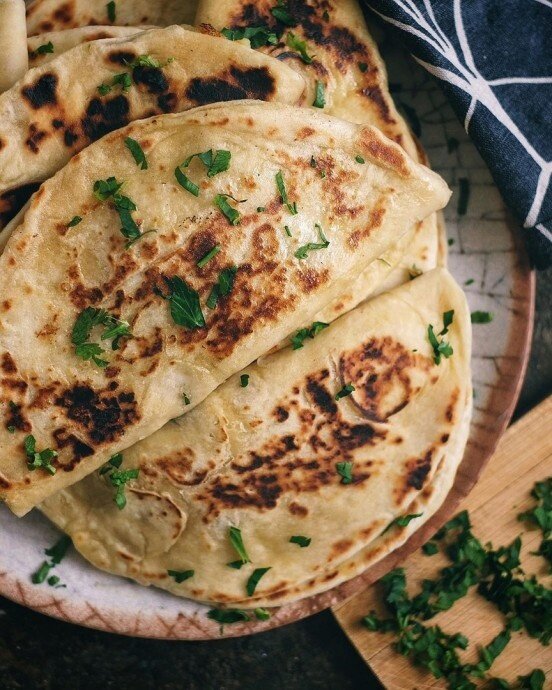 5. Готовые лепешки переносятся на тарелку и смазываются кусочком сливочного масла для придания дополнительно аромата. Для более насыщенного вкуса можно поместить их в керамическую емкость, положить сверху масло и накрыть фольгой, поставив в духовку при 180°C на 10 минут для пропитывания.