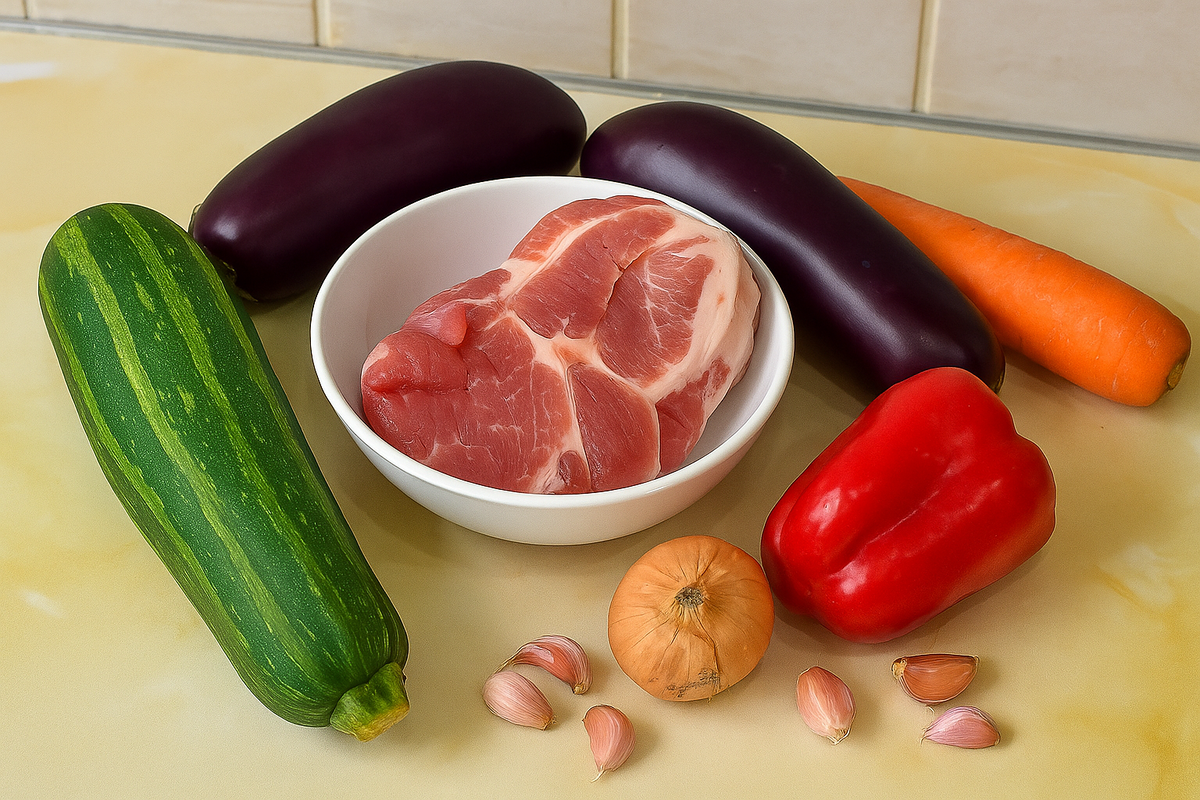Вернуть мясо в кастрюлю, добавить бульон, чтобы он едва покрывал ингредиенты, и довести до кипения. Засыпать специи, накрыть крышкой и тушить на минимальном огне 40-50 минут, следя за уровнем жидкости. В процессе торжества добавить баклажаны и болгарский перец, затем, спустя 15 минут, добавить кабачки и на финальных 5 минутах добавить чеснок.