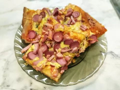 3. Формирование и выпечка пиццы. После того как тесто увеличится в объеме, разделите его на половинки. Раскатайте каждую часть в тонкую лепешку. Переложите тесто на противень, смазанный пергаментом. Обильно намажьте базу кетчупом и майонезом, равномерно распределите начинку и посыпьте тертым сыром и укропом. Разогрейте духовку до 180 градусов и выпекайте 15-20 минут, пока края не подрумяниваются, а сыр не начинает пузыриться.