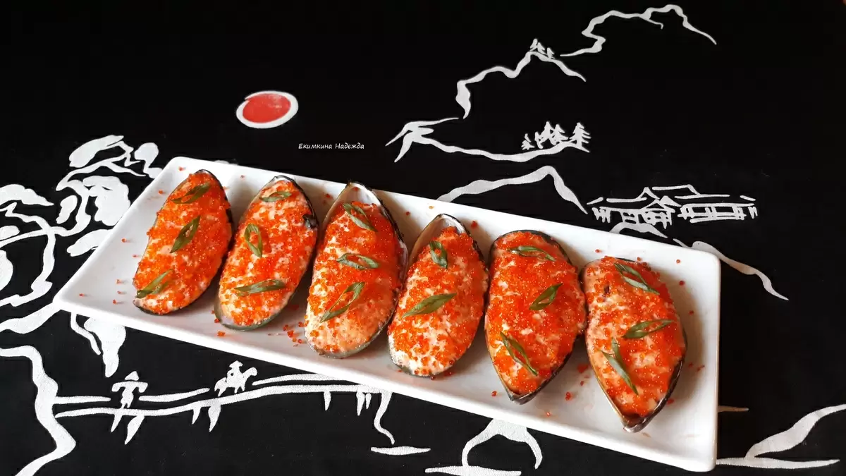 Сразу после запекания украсить мидии икрой и зелёным луком, аккуратно разместив их на подаче. Блюдо готово: оно выглядит потрясающе и становится настоящим фаворитом при подаче горячими.