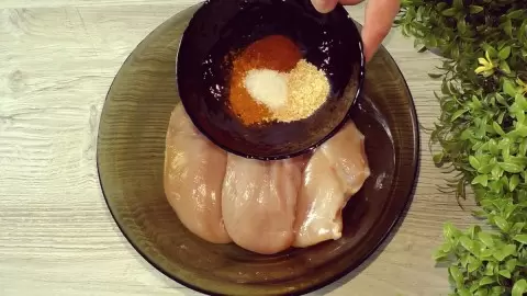 Далее следует аккуратно натереть куриное филе получившейся специями, чтобы каждый кусочек пропитался ароматом.