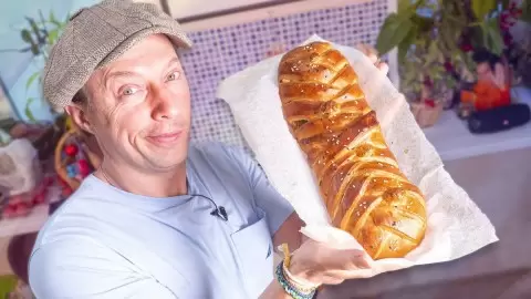 Как только начинка остынет, убираем кости и распределяем начинку по центру теста, оставляя пространство с боков. Сверху выкладываем несколько листиков базилика. Края теста надрезаем на полоски, чтобы удобно закрыть начинку. В отдельной миске взбиваем яйцо, добавляем молоко и воду, затем промазываем внутреннюю часть теста.