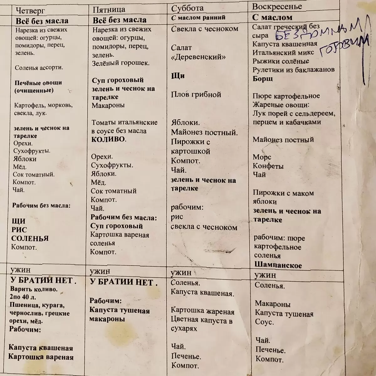 В обеденном меню для братии присутствают: